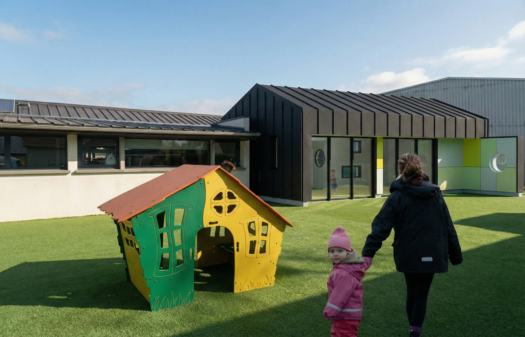 Concernant le gabarit, le bâtiment existant étant visuellement constitué de plusieurs travées, le principe est de recréer une travée permettant d’accueillir la salle de motricité. Cette travée complémentaire sera de largeur et de hauteur similaire aux travées existantes. Les pentes de toiture seront également conformes au bâtiment existant.