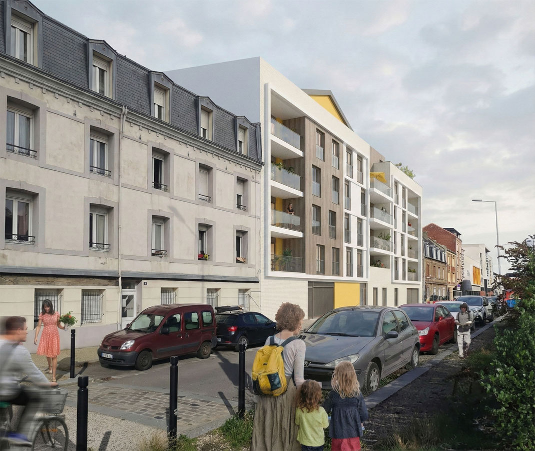 L’ensemble des choix de matériaux et de teintes liées au projet se fait avec équilibre et complémentarité. Les couleurs sont définies suivant la palette offerte par le quartier composé d’une véritable alternance entre édifices en brique et immeuble recouvert d’enduits colorés.