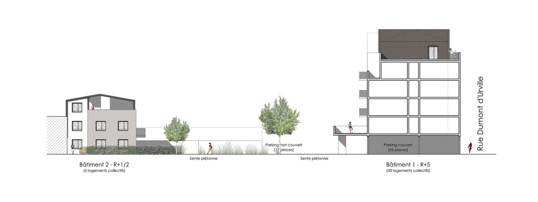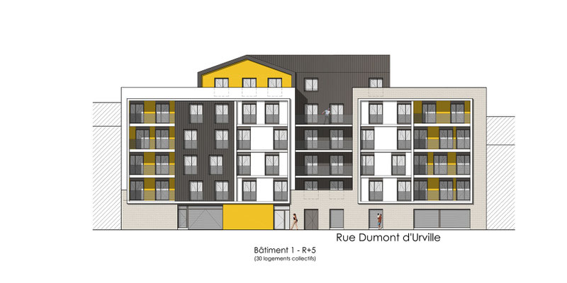 · Un immeuble R+4+attique (Bât.1) sur la rue Dumont d’Urville, constituant un front bâti calé sur les gabarits des constructions récentes avoisinantes, permettant, par sa densité, de renforcer l’aspect urbain de l’axe Dumont d’Urville reliant le centre du quartier de l’Eure (place Désiré Rebeuf, carrefour en étoile Mouchez / Marceau / Dumont d’Urville) au parc quai de Saône faisant l’interface avec le port.