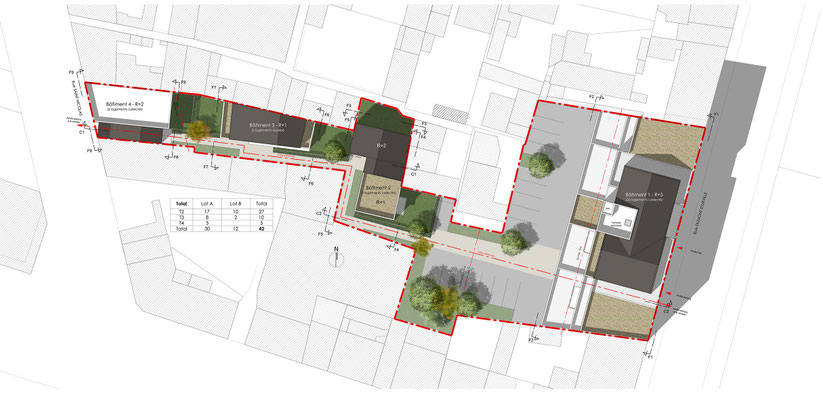 Après analyse et prise en compte de l’ensemble des contraintes liées au site, à la réglementation, à l’environnement et aux bâtiments existants, nous proposons un plan masse constitué de 4 bâtiments répartis comme suit :