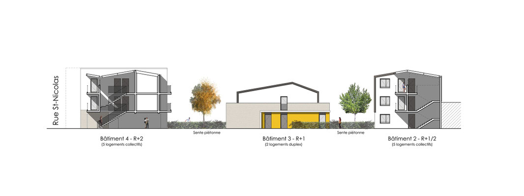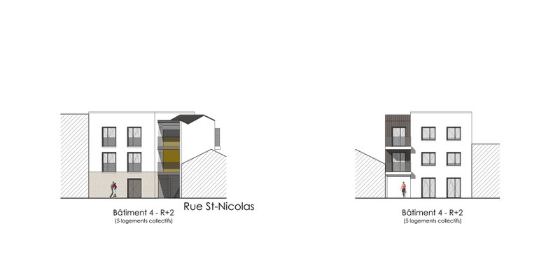· Un immeuble R+2 (Bât.4) sur la rue Saint Nicolas, adapté au gabarit des immeubles de la rue, et indiquant architecturalement la venelle traversant l’ilôt.