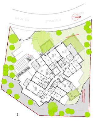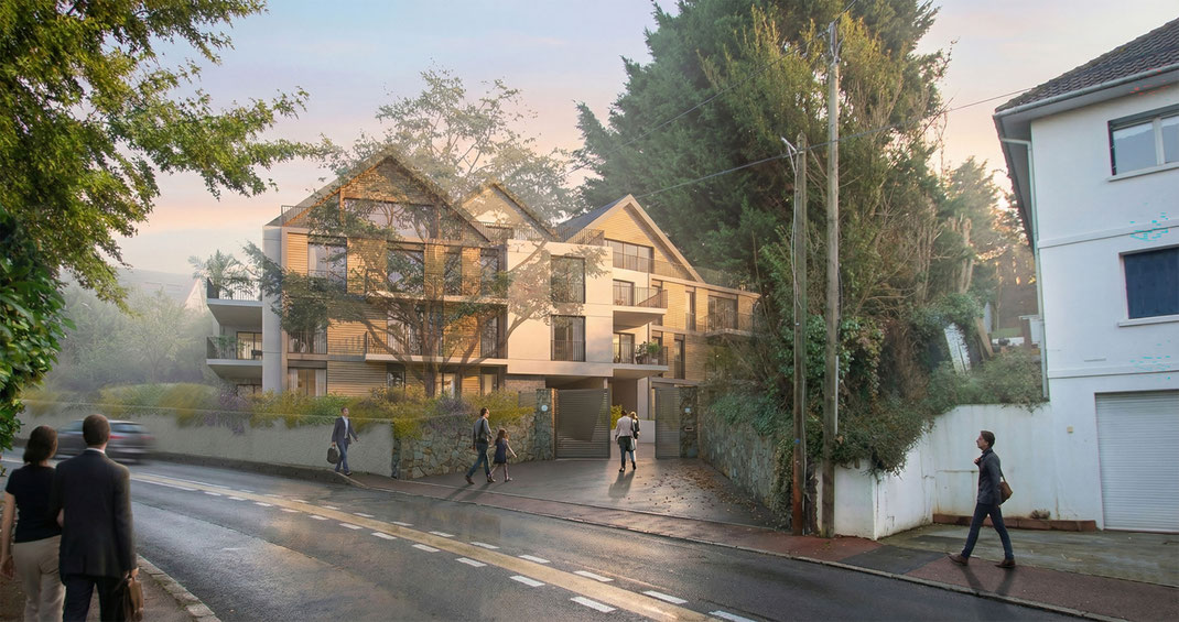 Cet immeuble de logements s’organise en deux volumes rectangulaires imbriqués de hauteur R+2+C. Il vient s’implanter dans un quartier résidentiel proche du centre urbain, présentant un tissu homogène constitué essentiellement de maisons individuelles. L'objectif dans l'organisation des volumes et leur imbrication est de trouver une expression qui traduise une architecture contemporaine s'intégrant parfaitement à la typologie environnante en cassant l'échelle du bâtiment collectif.