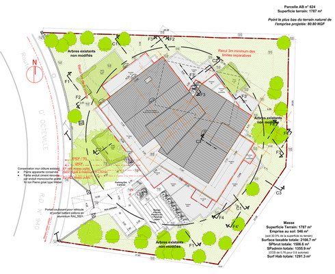- Nécessité de conserver, sans modification, l’ensemble des arbres existants tout en valorisant l’espace boisé continu de la zone dans laquelle s’implante la parcelle.